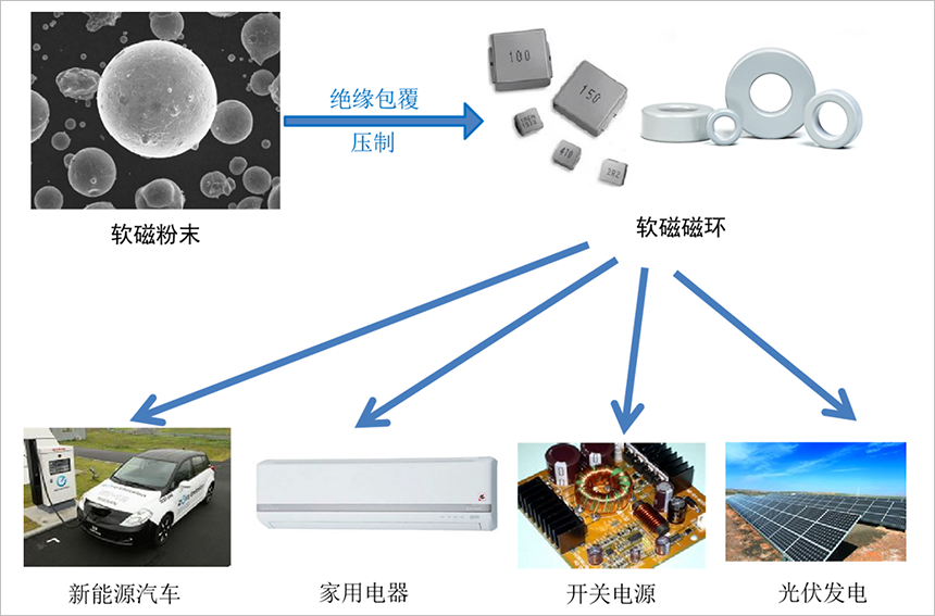 軟磁合金粉末通過絕緣包覆、壓制成型和熱處理等工藝等粉末冶金工藝制備軟磁復合材料,該材料具有磁電轉換和儲能濾波的特殊功能,是制備電動汽車充電樁用電抗器、家用電器PFC電感、光伏發電用逆變器、扼流圈和高頻濾波器的部件之一,廣泛應用于電動汽車、新能源、信息技術、電力電子等領域。