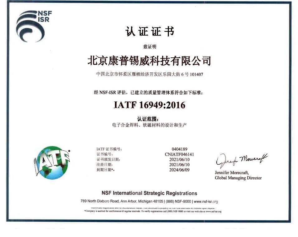 北京康普錫威科技有限公司順利通過(guò)了江蘇艾凱艾國(guó)際標(biāo)準(zhǔn)認(rèn)證有限公司關(guān)于IATF 16949:2016質(zhì)量管理體系的認(rèn)證和審核,并于2021年6月16日獲得了IATF 16949:2016質(zhì)量管理體系認(rèn)證證書(shū)。