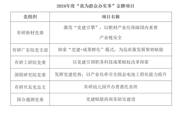 2024年度,各級黨組織聚焦本單位有關科技創新、生產銷售、深化改革、人才發展、職能管理、職工權益等方面的難點、堵點、痛點工作,在集團立項19個“我為群眾辦實事”項目。經組織評審組專家答辯評審、結題評審等,共評出6項年度“我為群眾辦實事”金牌項目、5項優秀項目,名單如下: